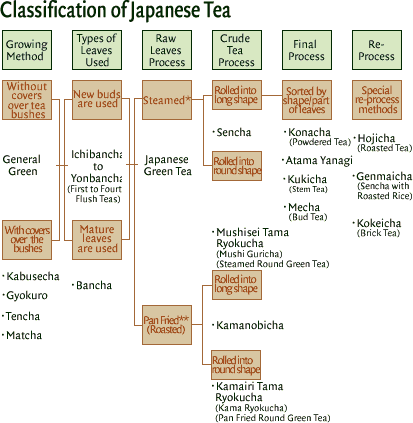 Tea Classification: By Processing Method - Tea processing is divided into three categories: nonfermented, semifermented and fully fermented. Japanese green tea processing is nonfermented.
