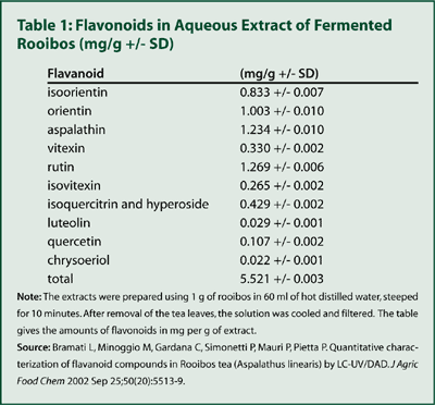 Although studies like these show quercetin and luteolin are strong antioxidants, researchers haven’t yet determined whether enough of either of these two flavonoids are present in rooibos tea and absorbed by the body to have beneficial effects. As shown in Table 1, recent analysis of fermented rooibos found considerably more quercetin than luteolin,19 but even quercetin was present in much lower amounts than aspalathin, orientin, and rutin.