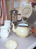 Use more tealeaves than you would for Japanese tea. Fill with hot water to the top of the pot. It is important to remove bubbles from the surface of the tea with the cover of the pot. Covering the pot will also prevent loss of aroma. Once again pour hot water over the teapot to maintain the proper temperature.